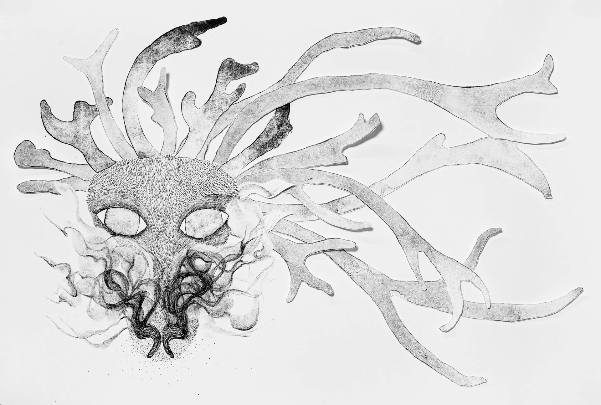 Brinich-Langlois points out how moments of wonder are created by the contradictions of science, magic, suspicion, conflict, and confusion. Unnamed ideas linger at the edge of consciousness, becoming a force of fear and disruption as faceless entities are formed from folded paper. These floral, winged, many-legged monsters are made of many worlds and meander through the spaces in between. As Brinich-Langlois says of her work, “Universes come together and break apart. Everything is in motion. Everything is alive.”